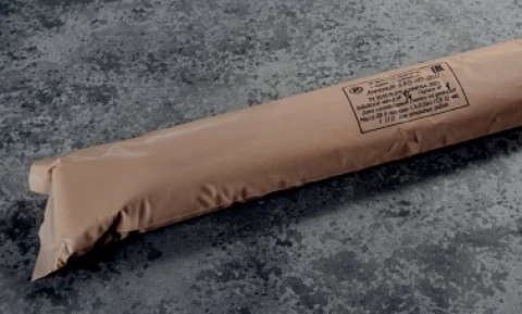 Заряд в полиэтиленовой оболочке, заполненный порошкообразным взрывчатым веществом от желтого до оранжевого цвета